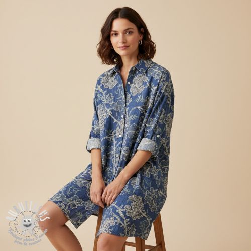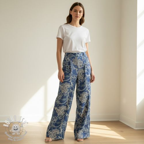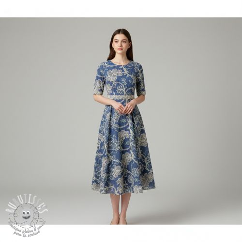 Tissu coton JEANS Embroidery leaves light blue