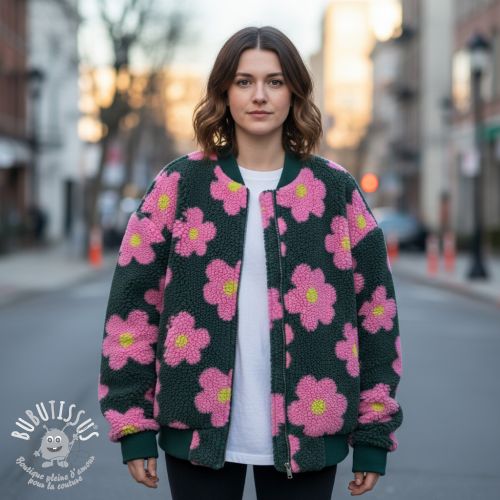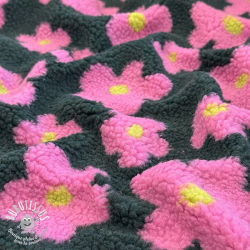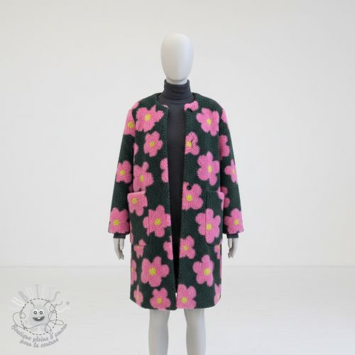 Tissu de manteau TEDDY JACQUARD Flowers army green/pink